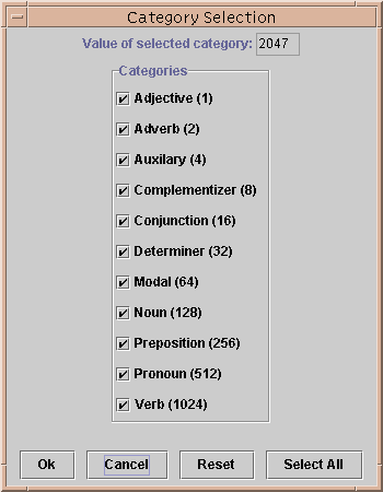 Two GUI dialogs of selecting categories and inflections are shown below.