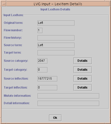 As shown above, all fields of an (input) LexItem are shown in this dialog box. Four details buttons are provided to users to view the category and inflection in value as well as in name.